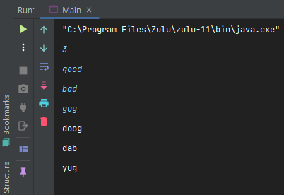 N개의 단어를 입력된 순서대로 한 줄에 하나씩 뒤집어서 출력합니다.