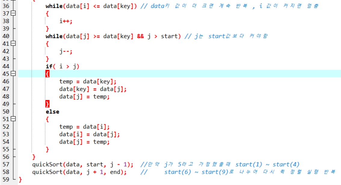 - 피벗 앞에는 피벗보다 값이 작은 모든 원소들이 오고, 피벗 뒤에는 피벗보다 값이 큰 모든 원소들이 오도록 피벗을 기          준으로 배열을 둘로 나눈다. 이렇게 배열을 둘로 나누는 것을 분할(Divide) 이라고 한다.