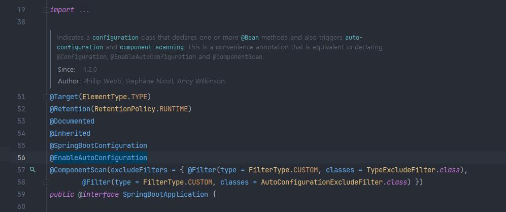 @Configuration, @EnableAutoConfiguration 및 @ComponentScan을 선언하는 것과 동일한 편리한 주석입니다.