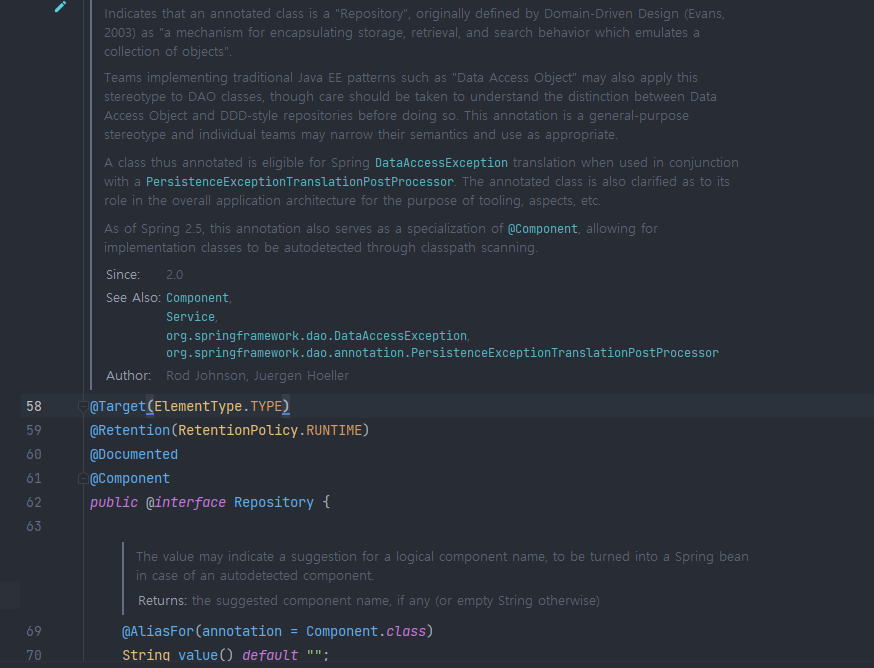 이 주석은 @Component의 전문화 역할을 하여 구현 클래스가 클래스 경로 스캔을 통해 자동 감지되도록 합니다.