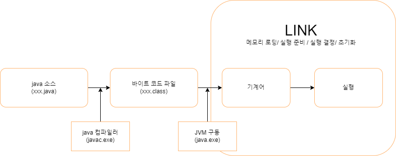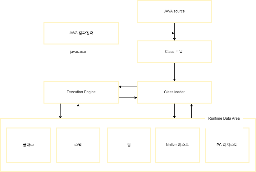 - JVM이 OS에게서 메모리 사용권한을 할당받고 JVM이 자바프로그램을 호출하여 실행하게 된다.