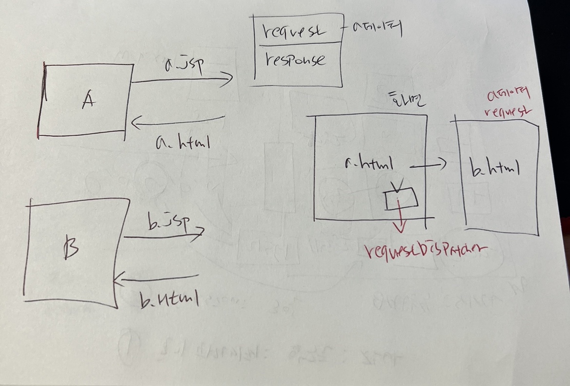 이때 b.html을 웹브라우저에 보여주면서 b.jsp에 대한 새로운 request, response 객체가 만들어지기 때문에 기존의 객체는 사라지게 된다.