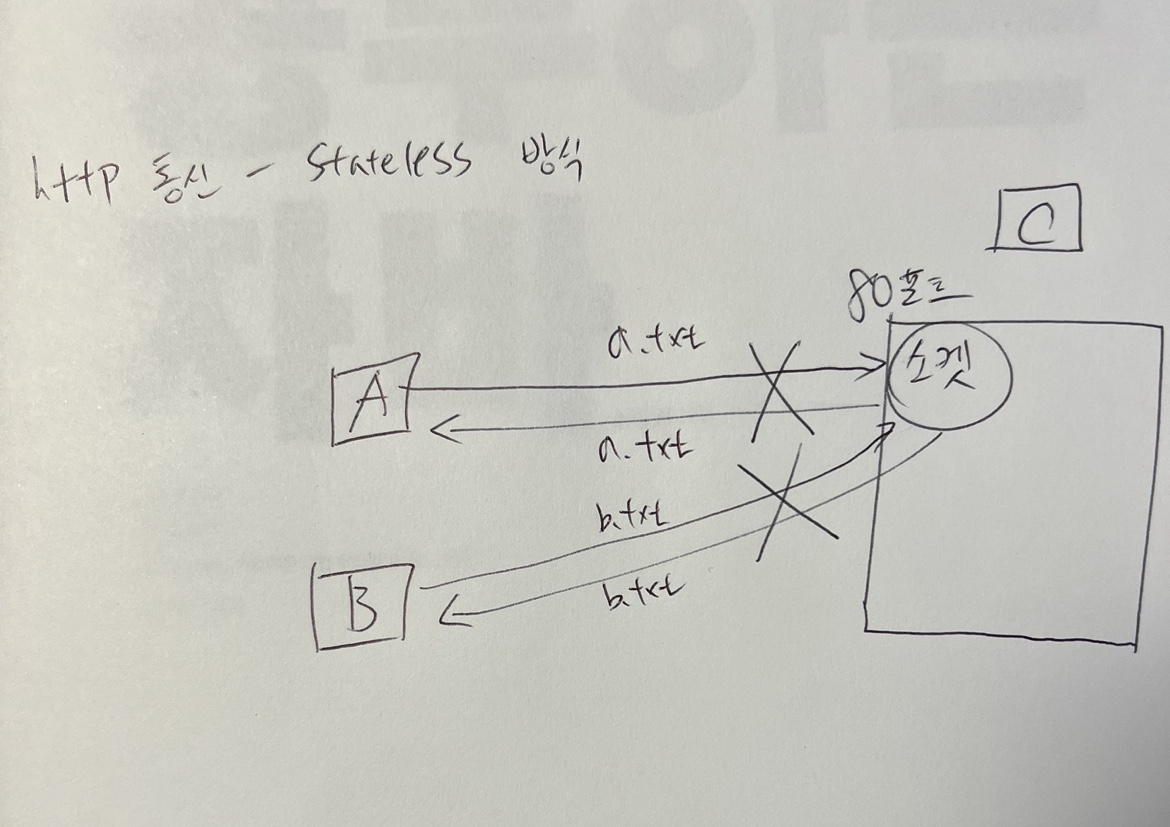 - 연결이 끊기기 때문에 부하가 적지만, 이전에 보냈던 요청이나 되돌려준 응답에 대해서는 기억하지 못하는 단점이 있다.