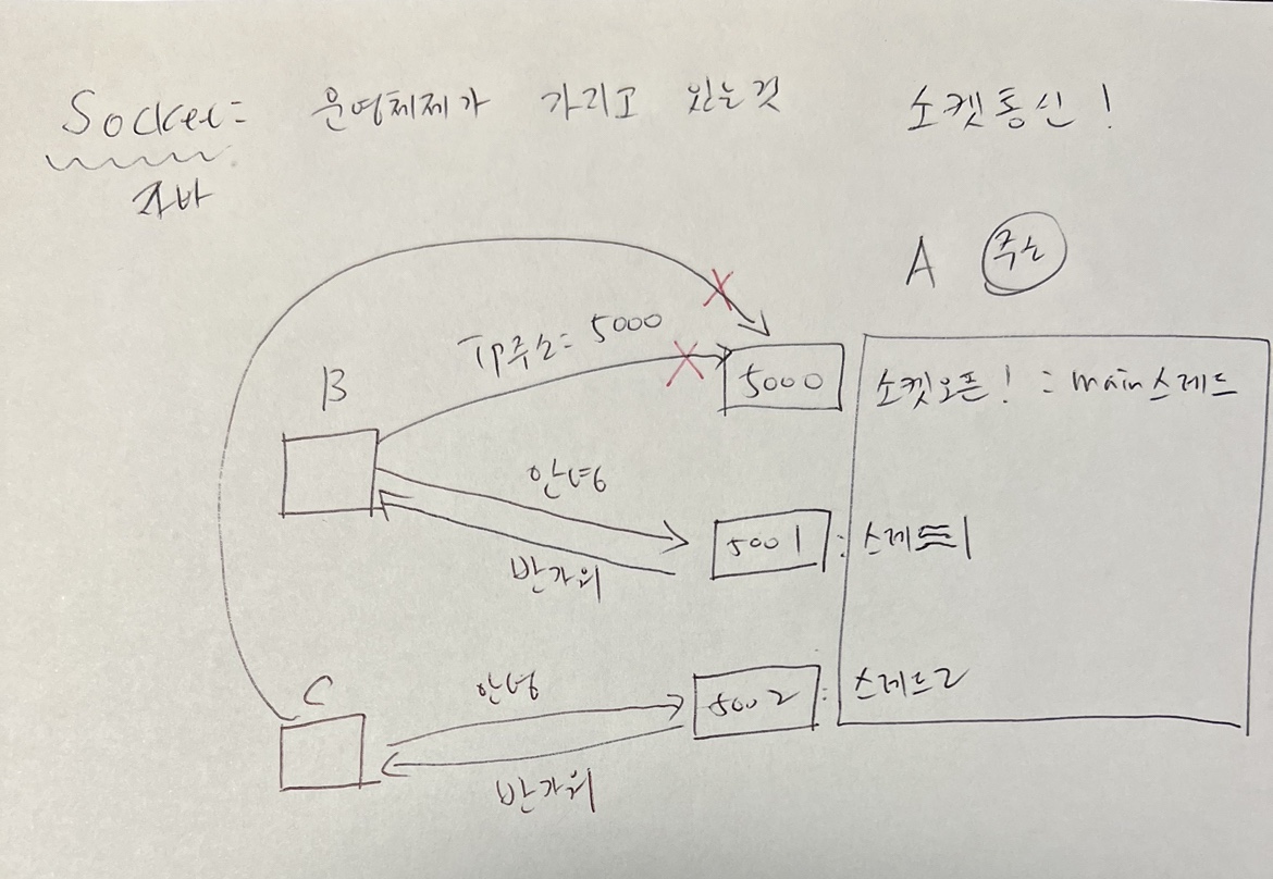 예를들어 A가 5000번 포트번호로 최초의 연결 용도로 소켓을 오픈한다.