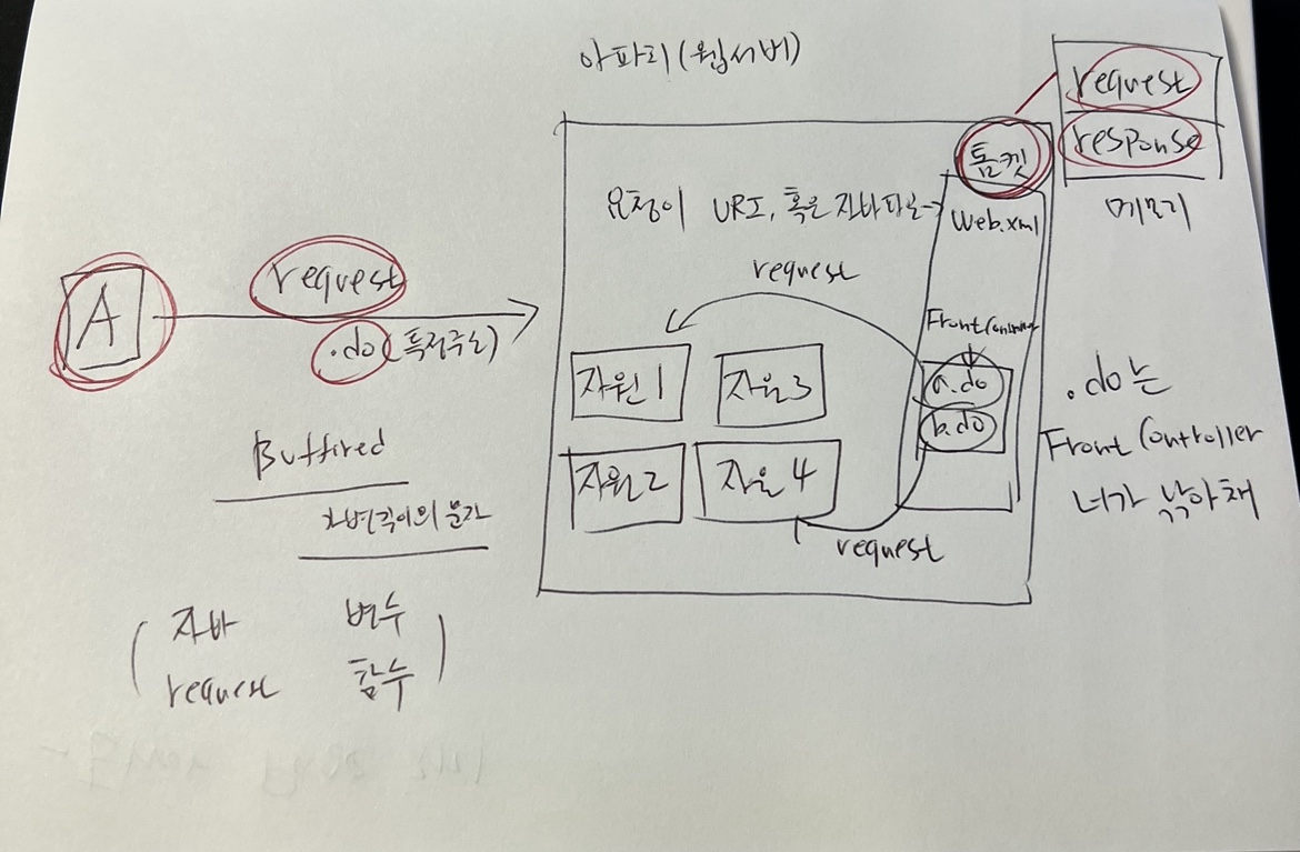 그리고 FrontController에서 한번 더 해당 자원에 접근 할 수 있게 request가 발생하고 이에 응답하기 위해 response가 발생한다.