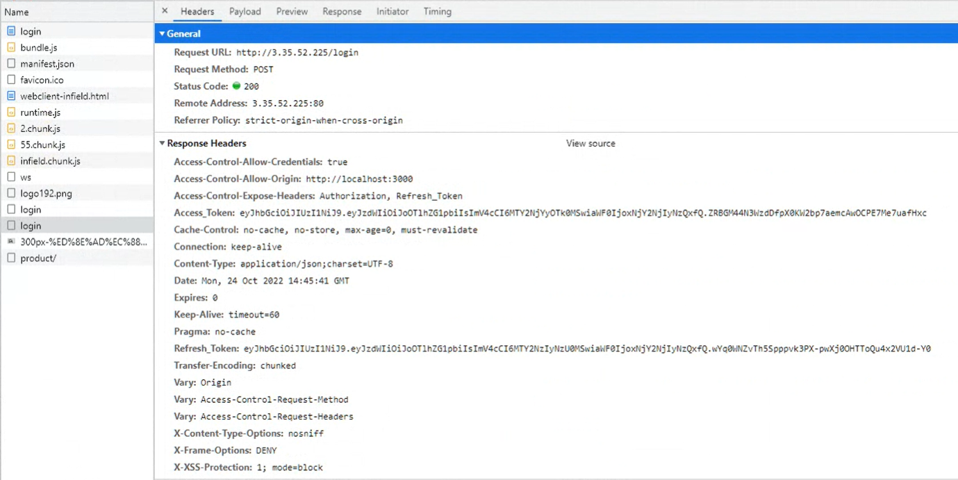 Cors 이슈가 해결되고 클라이언트 Response에 Access-Token과 Refresh-Token이 잘 생성 되었다.