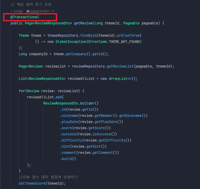 조회하는 로직이라고 생각하고 @Transaction이 원래 빠져있었기 때문에 @Transaction(readOnly = true) 값이 적용되고있었던 것이다. 그래서 값이 수정이 되어도 읽기 전용이기 때문에 값이 제대로 저장되지 않았던 것이다.