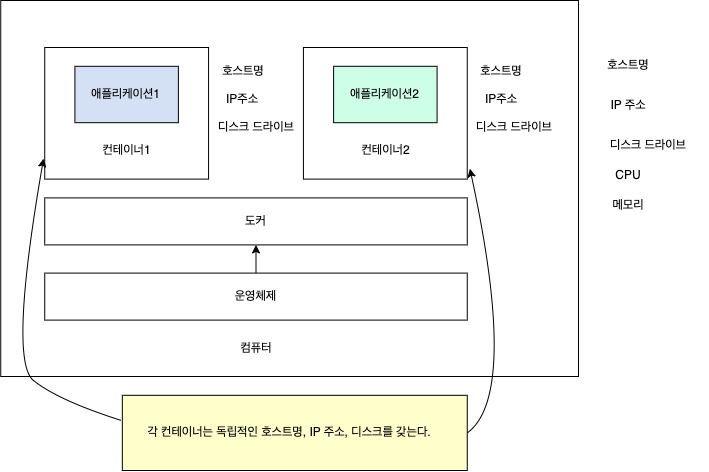 -> 도커가 관리하는 상자는 서로 독립적인 환경을 갖지만 상자가 실행되는 컴퓨터의 CPU와 메모리,
