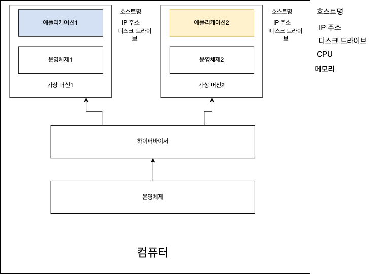모든 가상 머신은 호스트 컴퓨터의 운영체제, CPU, 메모리를 공유한다.