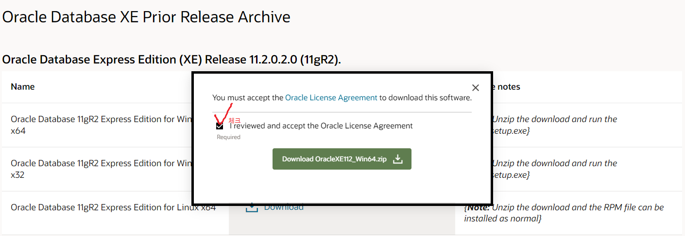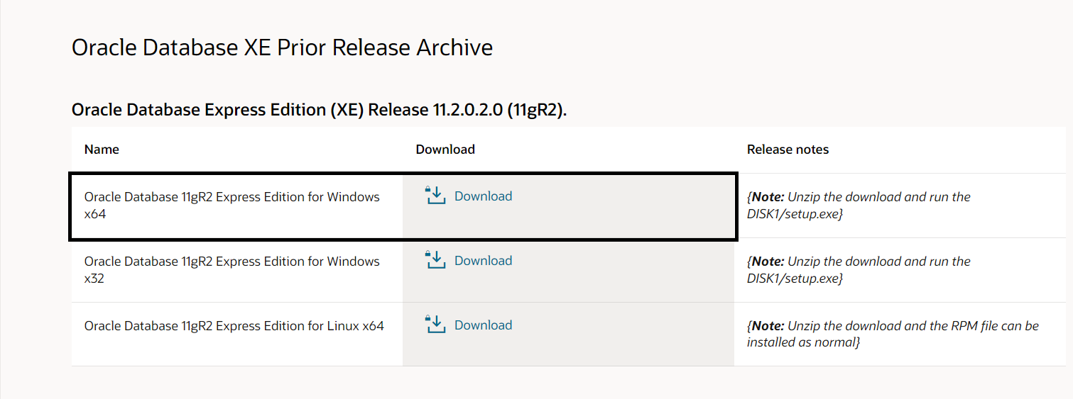 구글 검색 결과 https://www.oracle.com/database/technologies/xe-prior-release-downloads.html 이 링크를찾아서 다운로드 해주었다.