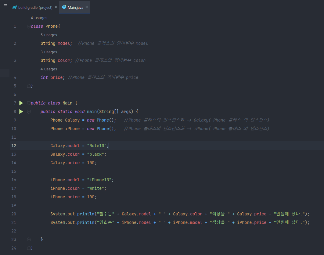 Phone Galaxy = new Phone(); 에서 Galaxy = 객체이다.