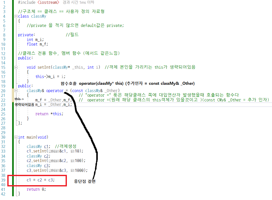 반환타입이 클래스명 + &인 이유는 c1 = c2 = c3; 중에 c2 = c3가 먼저 연산 되는데
